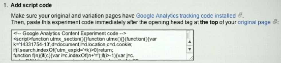 Nun, was muss ein Webseitenbetreiber also für einen Test leisten? Erstens muss jeder der Test-Varianten erstellt werden. Dabei muss sichergestellt werden, dass diese Varianten jede über eine eigene URL erreichbar sind. Ein Test wird in GA Content Experiments über einen Assistenten eingerichtet; hier müssen die URLs eingetragen werden. Zudem muss auf jeder der Seiten der Standard-Google-Analytics Tracking Code eingebunden werden. Auf die Original-Seite kommt zusätzlich noch ein Content Experiments Java Script Code, welcher den Test bzw. die Auslieferung der Test-Seiten letztendlich steuert. Dabei werden die Nutzer auf eine der Test-Varianten weitergeleitet. Google Analytics Tracking Code sorgt dann für das Sammeln der Daten.