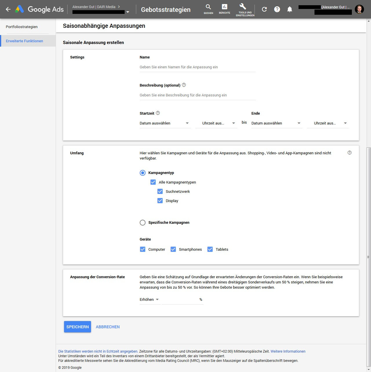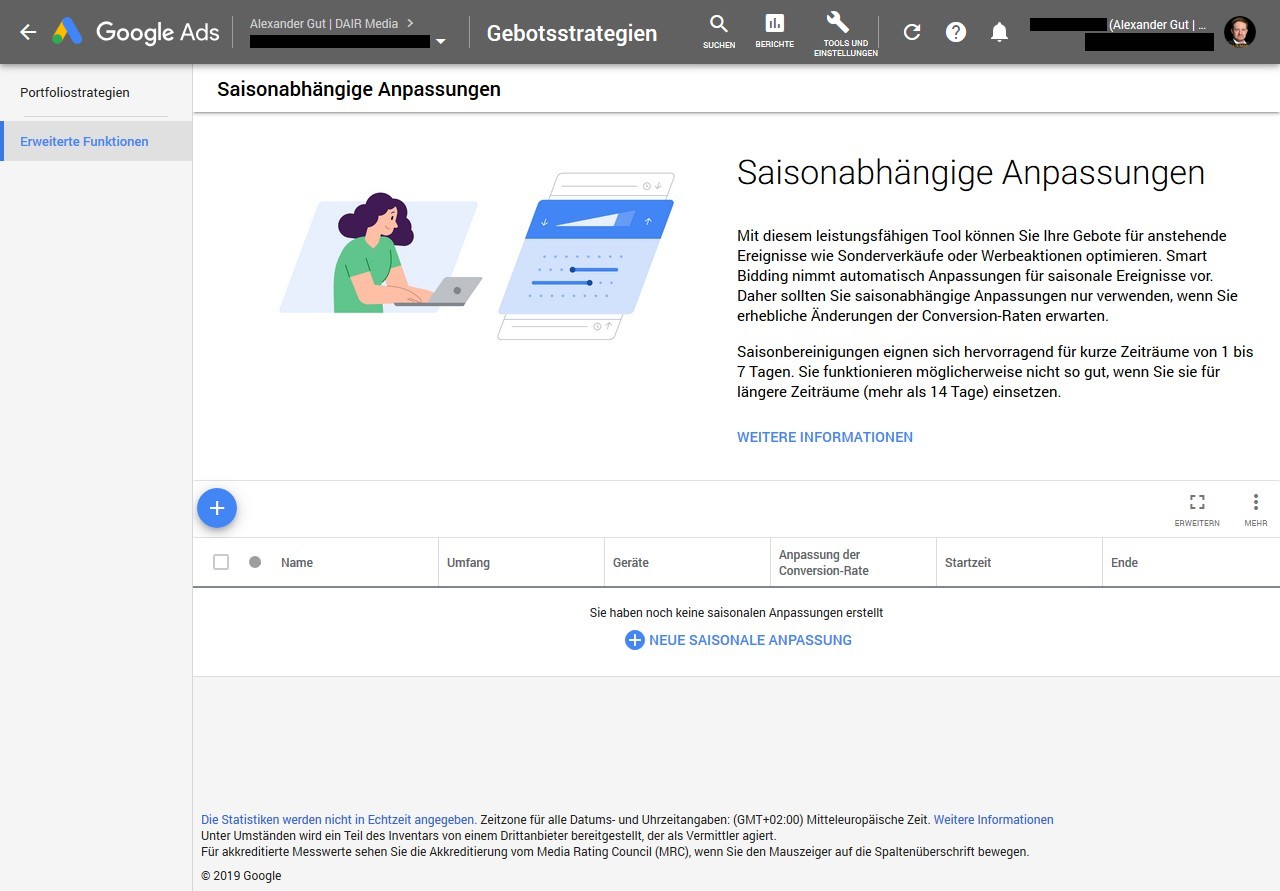 Die saisonabhängigen Anpassungen sind anscheinen bereits in allen Google Ads Accounts verfügbar. Die Funktion ist sehr sinnvoll, damit die automatische Gebotssteuerung bei kurzen Aktionen für eine bessere Kampagnenperformance sorgen kann, etwas bei Wochenend-Sales, Black Friday, Cyber Monday etc. Jedoch ist die Funktion noch recht unflexibel. So können keine längeren Aktionszeiträume eingegeben werden, wie zum Beispiel vor Weihnachten oder anderen Feiertagen sinnvoll gewesen wäre. Auch müssen die Nutzer eine mögliche Änderung der Conversion-Rate selbst schätzen und eingeben. Falsche Werte können dann eher zu einer Verschlechterung der Kampagnen-Performance führen. Hoffentlich wird Google die Funktion mit der Zeit noch erweitern und anpassen. Wer die saisonabhängigen Anpassungen jetzt schon ausprobieren möchte, sollte seine Google Ads Kampagnen genauer beobachten.